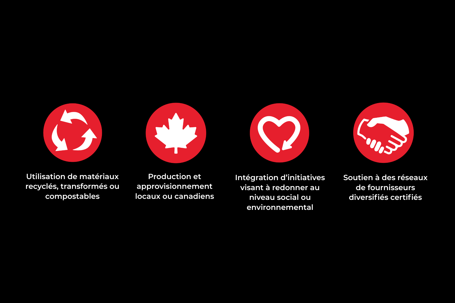 Autres avantages environnementaux : fournisseur certifié B Corp; utilisation de matériaux recyclés, transformés ou compostables; production et approvisionnement locaux ou canadiens; soutien à des réseaux de fournisseurs diversifiés certifiés.